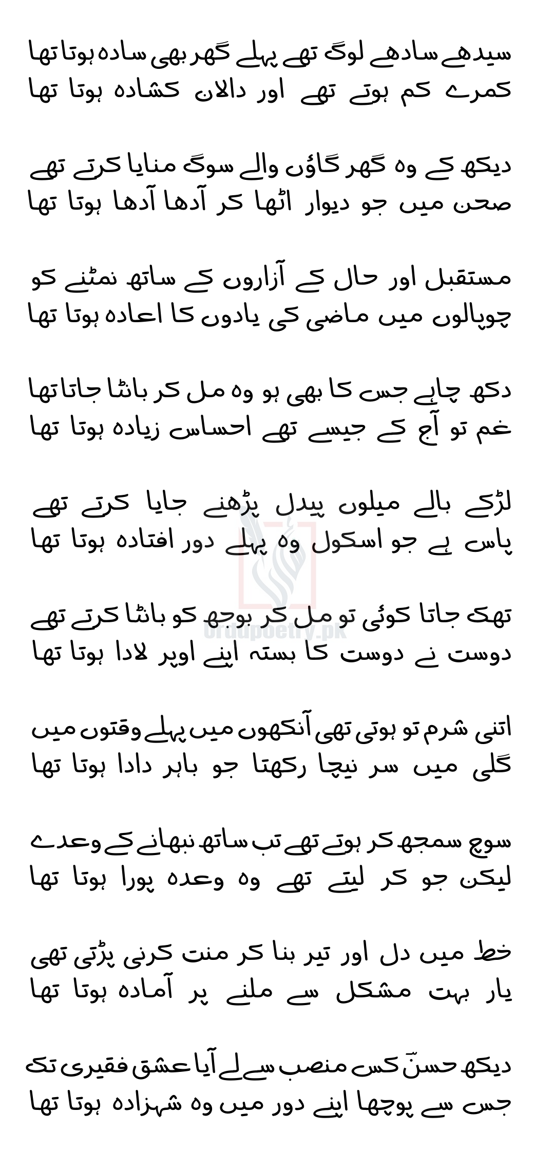 سیدھے سادھے لوگ تھے پہلے گھر بھی سادہ ہوتا تھا – احتشام حسن کی غزل admin دسمبر 21, 2021 غزلیں تبصرہ کریں 8,828 ویوز شئیر کریں Facebook Twitter Stumbleupon LinkedIn Pinterest